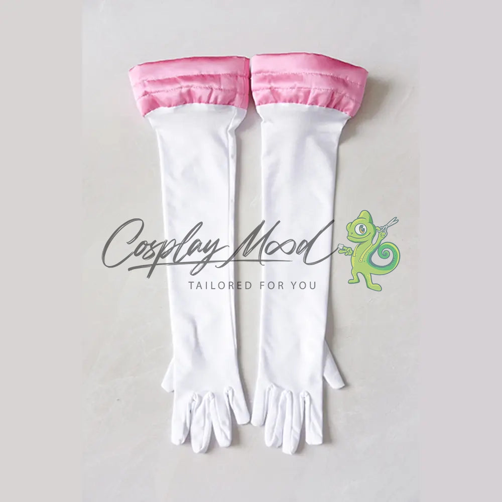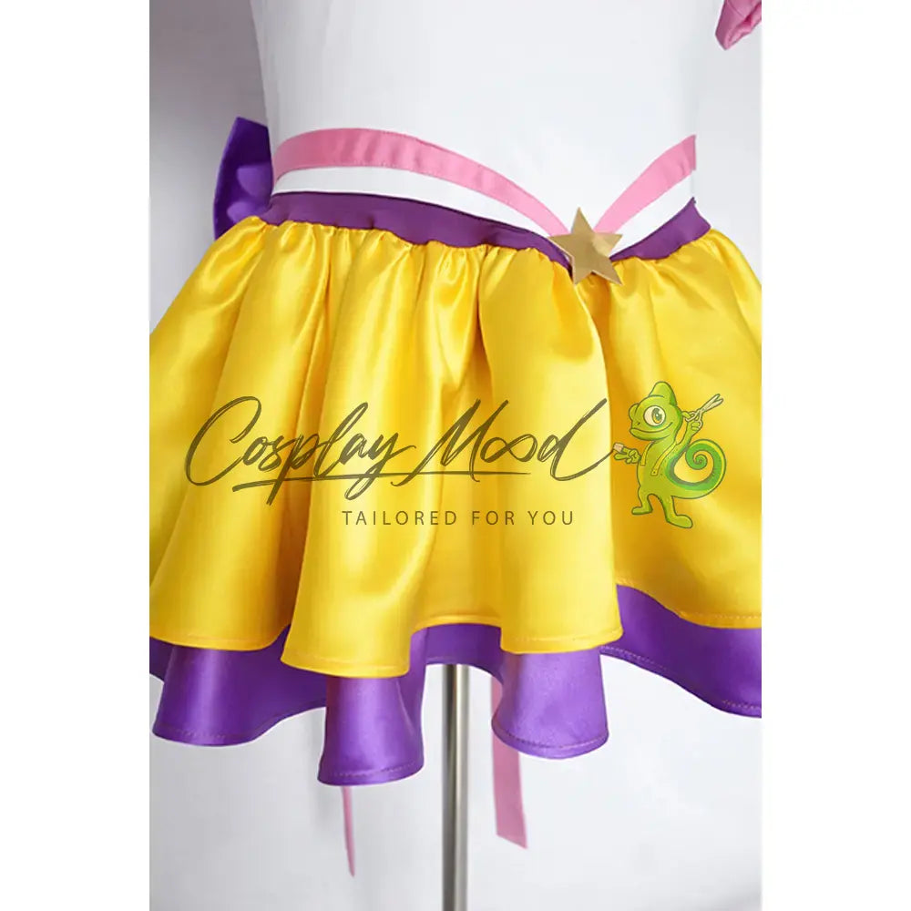 Vestito alla marinaretta con maniche a palloncino rosa, gonna gialla e sottogonna viola, choker rosa, guanti lunghi bianchi e rosa, fiocco posteriore per la schiena con strascico.